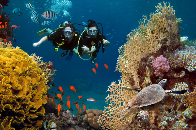 Guests can immerse themselves in the crystal-clear waters surrounding JA Manafaru to discover a vibrant underwater paradise steps from the shore. The island’s house reef teems with colorful coral formations and tropical fish. Guided snorkeling trips are also available, offering chances to encounter turtles, rays, and other marine life in the calm lagoons of Haa Alifu Atoll.